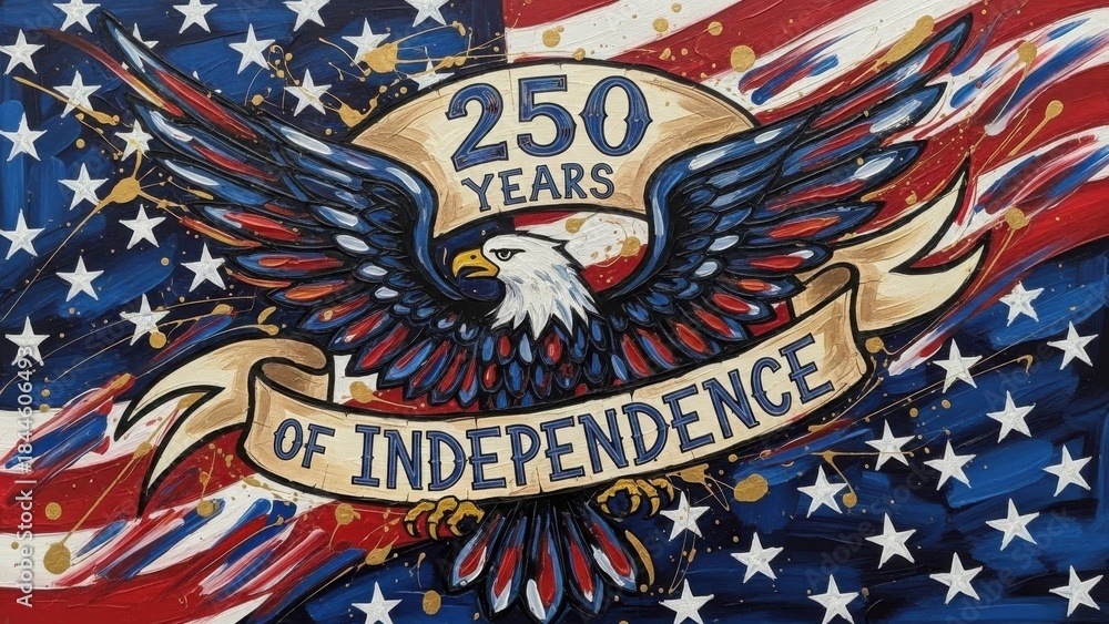 USA 250 years of independence emblem with bald eagle holding ribbon banner. Artistic American flag painting for patriotic semiquincentennial anniversary celebration holiday design art. #1844606493