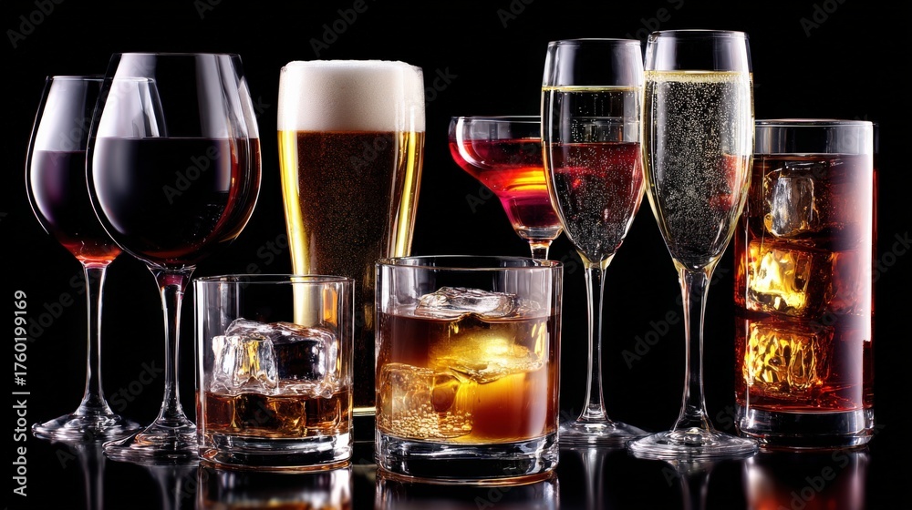 Variety of Alcoholic Beverages: Assortment of Wine, Beer, Cocktails and Spirits on Black Background #1760199169