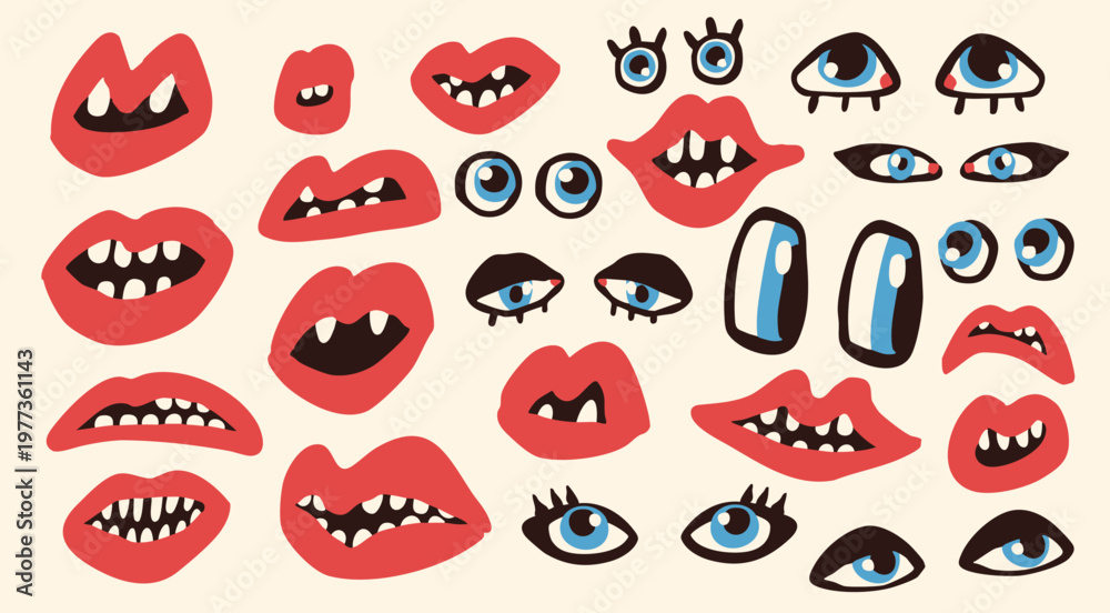 Various human Mouths, Eyes set. Teeth, red lips, eyelashes, pupils. Various mimic, emotions, expressions. Hand drawn trendy Vector illustration. isolated design elements #1977361143