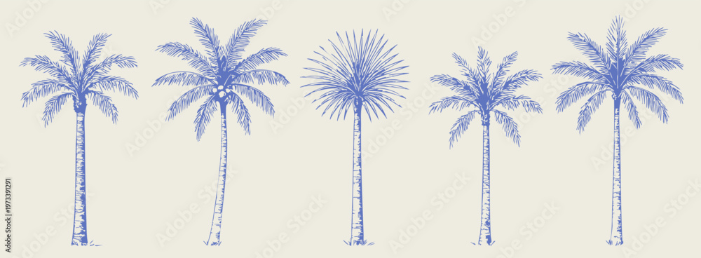 Various Palm tree set. Monochrome tropical plants. Coconut, beach palms. Abstract blue silhouettes. Hand drawn modern Vector illustration. Isolated design elements. Print, sticker templates #1973391291