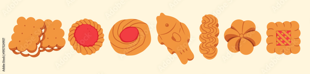 Various tasty crispy Cookies. Different biscuits, shortbread cookies. Bakery, dessert, sweets concept. Hand drawn trendy Vector illustration. Isolated design elements. logo, print, sticker template #1957524907