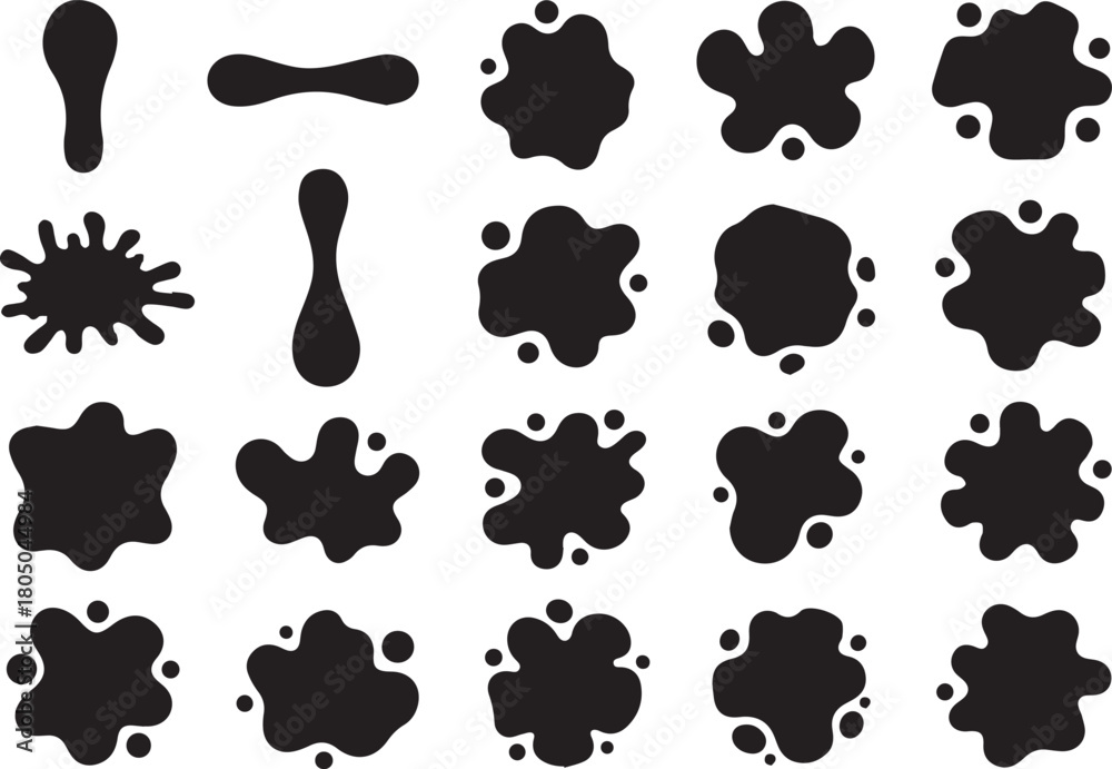 Vector abstract blob shapes set. Irregular organic element kit. Amoeba splotches. Liquid uneven spots. Asymmetric fluid splodge forms. Amorphous blob black silhouettes collection on white background #1805044984