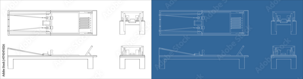 Vector blueprint illustration of a Pilates reformer machine viewed from top, front, and side elevations #1743476126