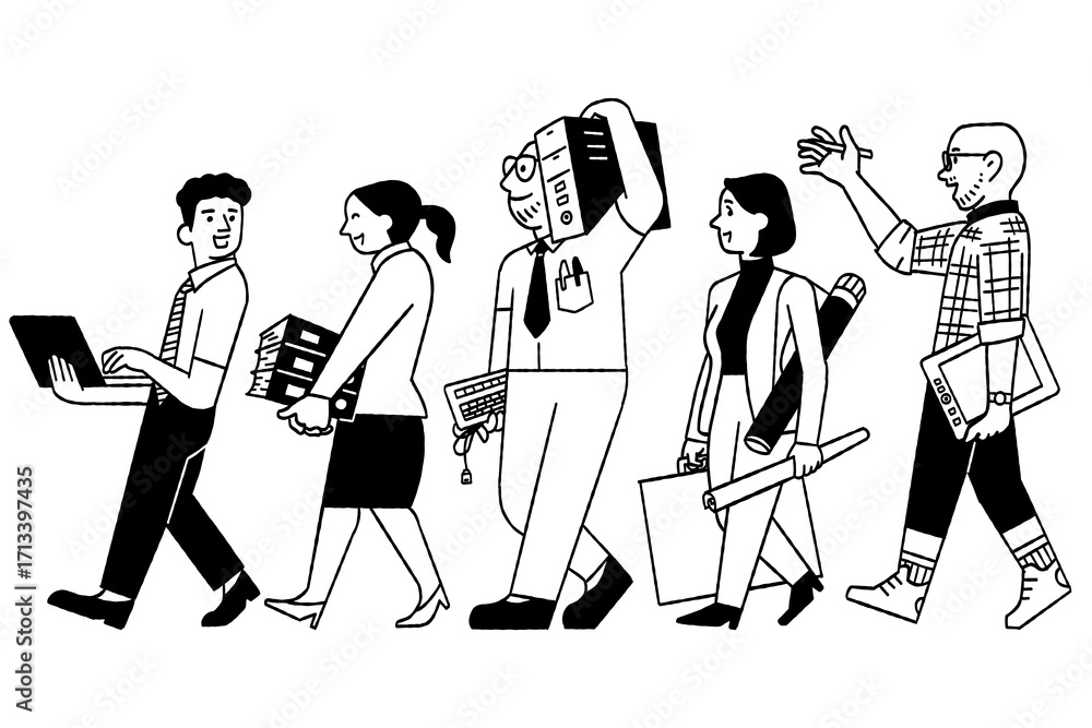 Vector character of young creative teamwork walking together in the same direction, smiling and happy. #1713397435