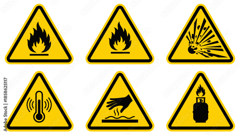 Vector icons Set of six yellow triangular warning signs indicating various hazards such as fire explosion high temperature and corrosive materials. Vector Illustration. EPS Editable #1858625117
