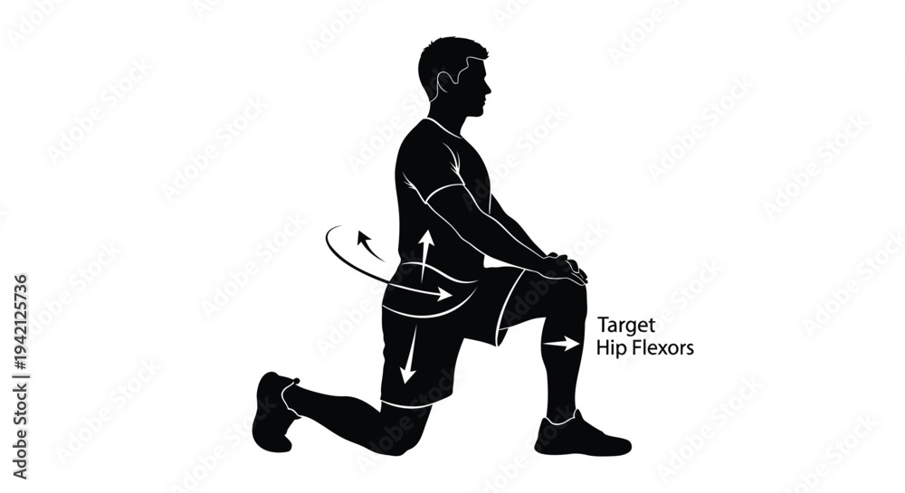Vector illustration of man doing lunge exercise, fitness and workout, targeting hip flexors #1942125736
