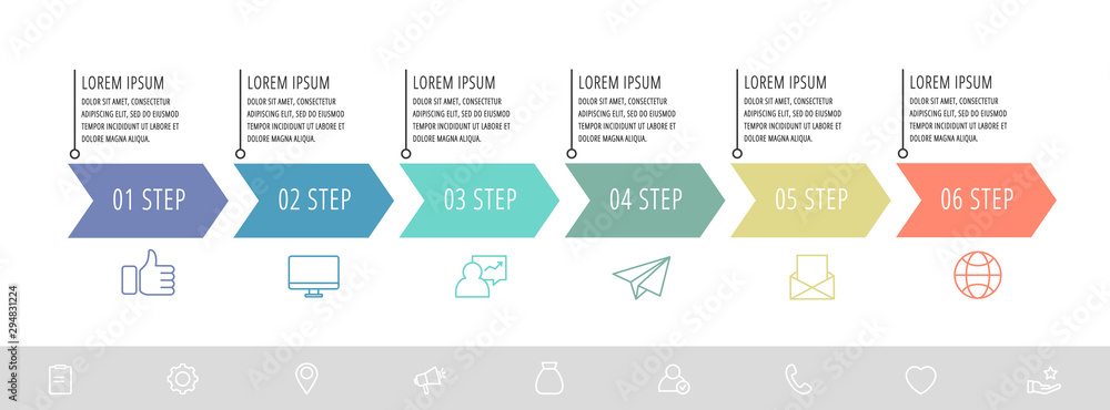 Vector infographic flat template arrows for six diagrams, graph, presentation. Business concept with 6 label. For content, flowchart, step for step, timeline, levels, marketing, data visualization #294831224