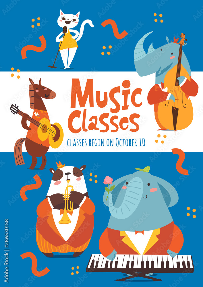 Vector music classes or lessons poster design with cute animals playing music #286530158