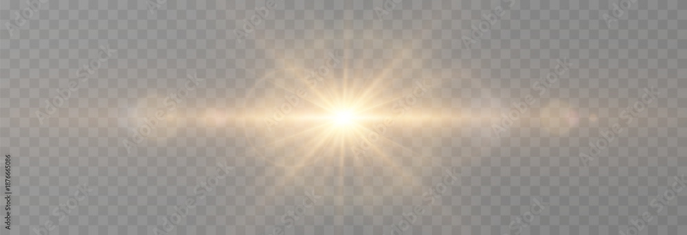 Vector realistic light PNG. Sun with rays and glare PNG. Sunlight or dawn on transparent background. Golden light. #1876665086