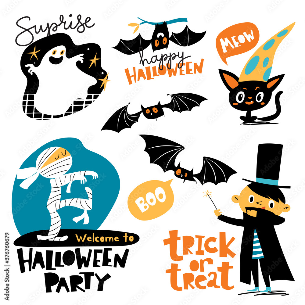 Vector Welcome to Halloween party stickers set in cartoon flat style #376760679