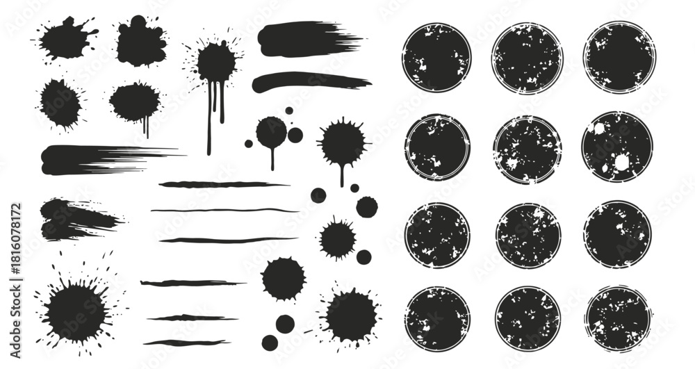 Versatile collection of black paint splatters grunge brush strokes spray graffiti stencil elements and ink blotches for dynamic design projects #1816078172