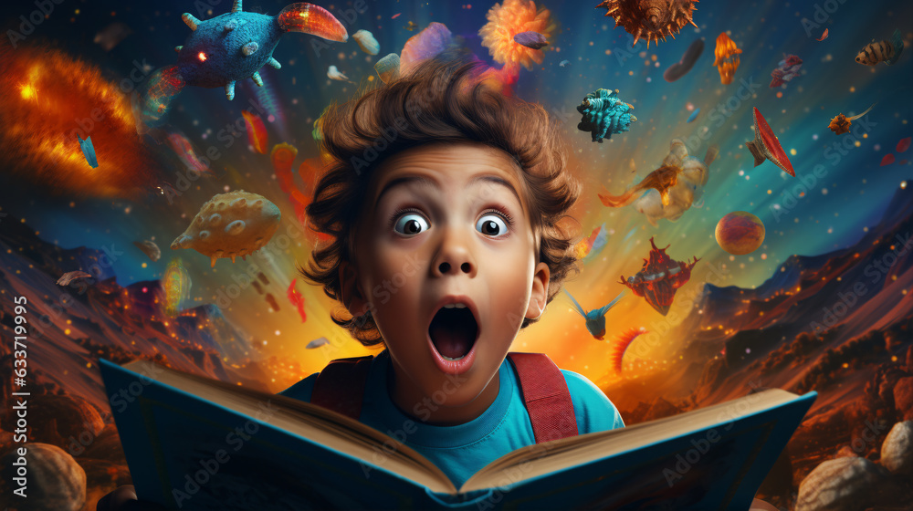 Very interesting adventure story in the book. Surprised little boy with shocked expression reading book, story isolated over colorful background. Education and imagination ad. #633719995