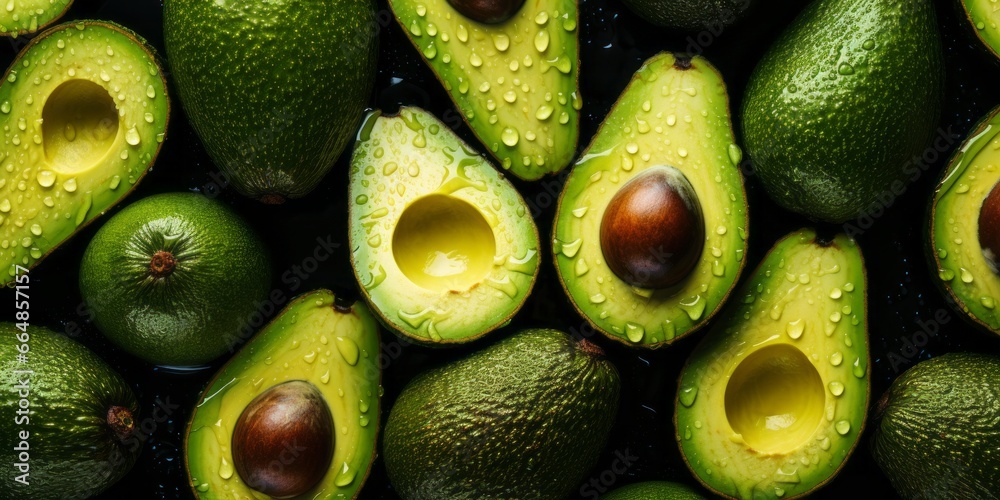 Vibrant and abstract avocado pattern with fresh and colorful sliced avocados. Perfect for banners and wallpapers, trendy exotic touch to any design. Ideal for diet, vegan, or healthy lifestyles. #664857157