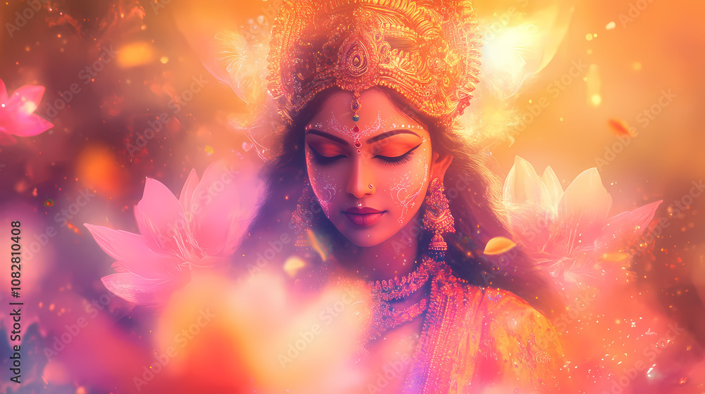 Vibrant double exposure representing the divine feminine power and the triumph of good over evil during the navaratri festival,with ample copy space for text overlay or design. Divine. Illustration #1082810408