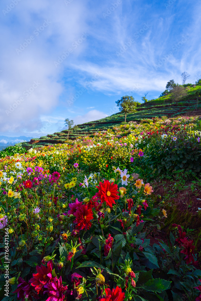Vibrant hillside garden with colorful flowers under bright blue sky, creating cheerful and lively atmosphere #1768471364
