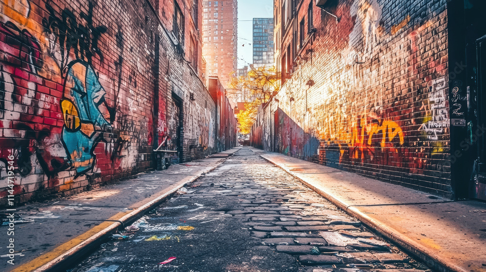 vibrant New York alleyway with graffiti, cobblestone path, and sunlight #1144719546