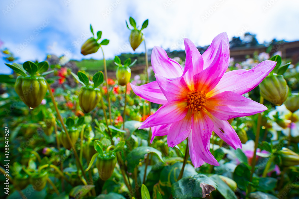 Vibrant pink dahlia flower in lush garden with green foliage and bright sky. scene is colorful and lively #1768471529
