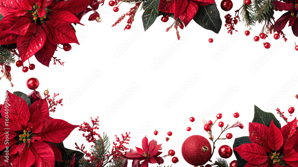 Vibrant poinsettia flowers arranged in a festive frame with berries on a white background. #1604099684