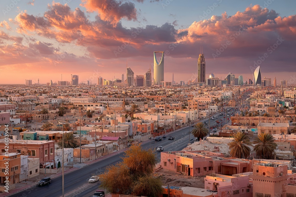Vibrant skyline of Riyadh at sunset with urban landscape and dramatic clouds illuminating the city #1426013904