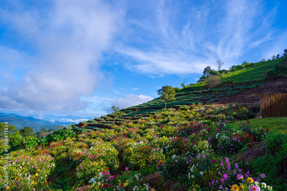 Vibrant terraced flower garden on hillside under bright blue sky with scattered clouds. lush greenery and colorful blooms create serene landscape #1768471424