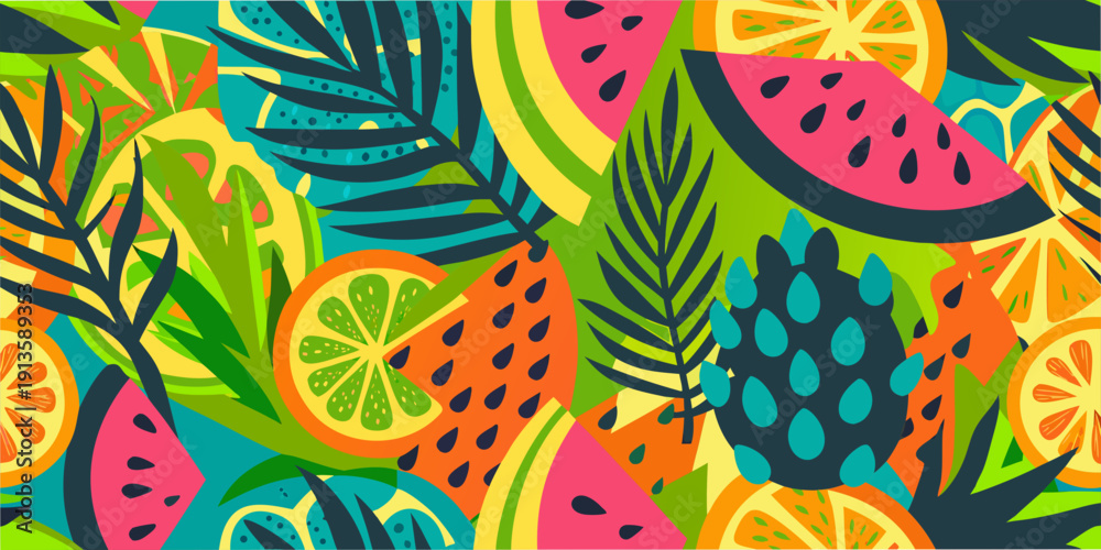 Vibrant tropical fruit and leaf pattern with bold colorful shapes #1913589353