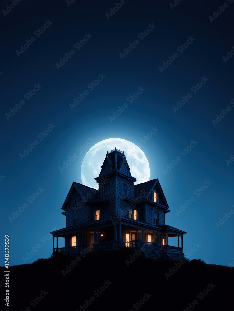 Victorian house under full moon at night. Haunted architecture silhouette with glowing windows and mysterious cinematic atmosphere #1748679539