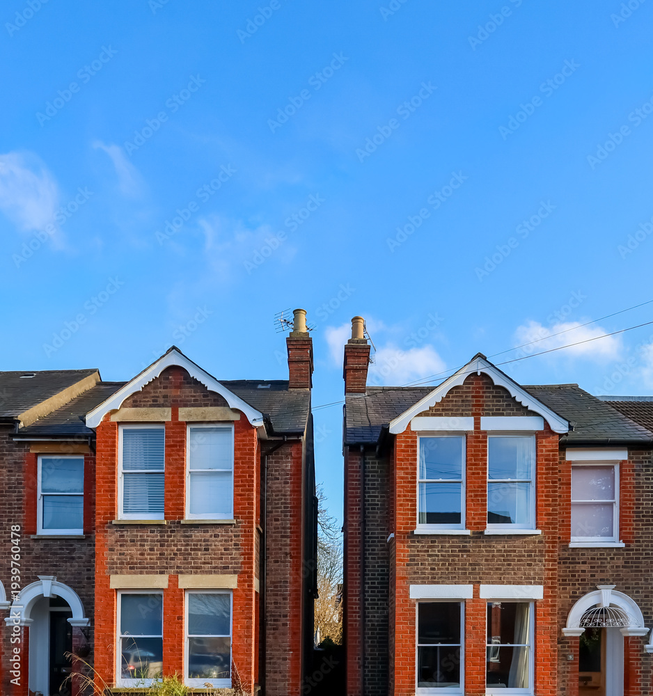 Victorian terraced houses in Hemel Hempstead, England, showing classic brick architecture and blue sky #1939760478