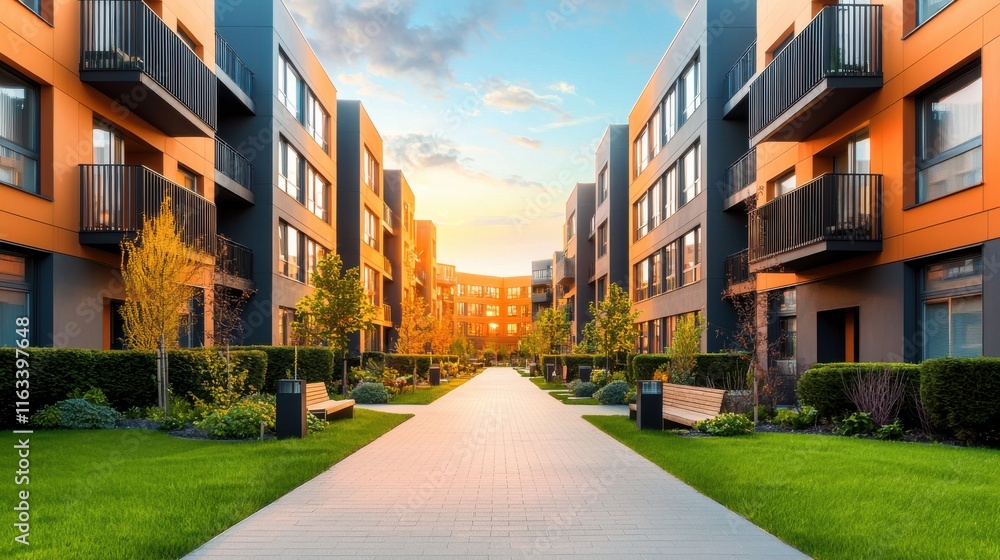 View of a multifamily apartment complex with contemporary architecture and green spaces. #1163397648