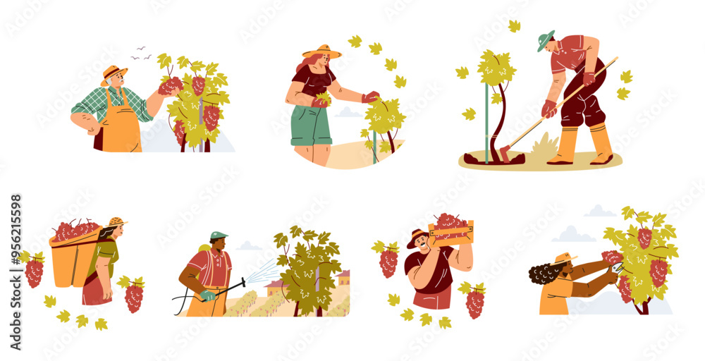 Vineyard workers and winemaking vector set #956215598