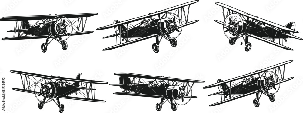 Vintage biplane illustrations, aviation icons, black and white vector, minimal layout, historical aircraft, flight symbols, retro plane design #1887354790
