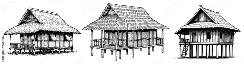 Vintage ink sketch of traditional Southeast Asian stilt houses with thatched roofs #1963647667