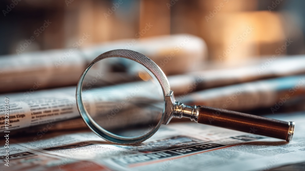 Vintage magnifying glass on scattered newspapers emphasizing the search for truth and investigation in journalism and literature from a bygone era #1782282147