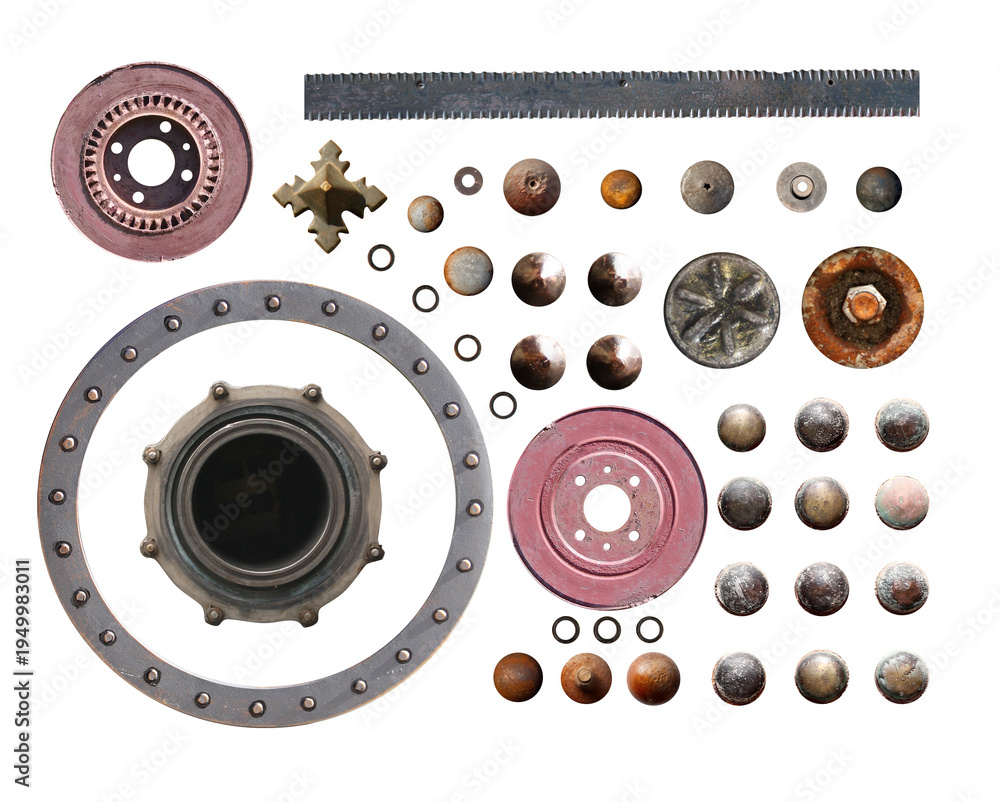 Vintage nail and rivet collection. Set of retro steel screw-nuts, rusty rivets hardware, old screw, nail head, metal plate and bolt for industrial and steampunk design. Isolated on white background #1949983011