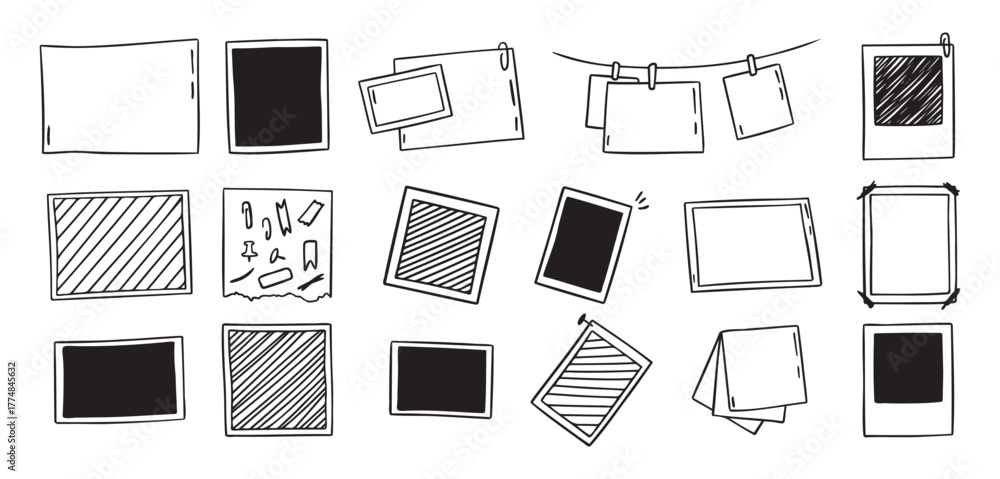 Vintage photo frames hand drawn doodle hanging on a clips icons set. Picture outline drawing template #1774845632