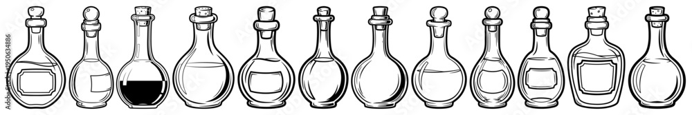 Vintage potion bottle seamless border Hand drawn vector sketch of old glass flasks for alchemy and magic #1950634886