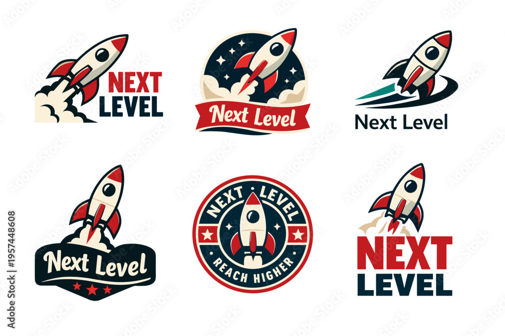 Vintage rocket launch logos with next level text and star accents #1957448608