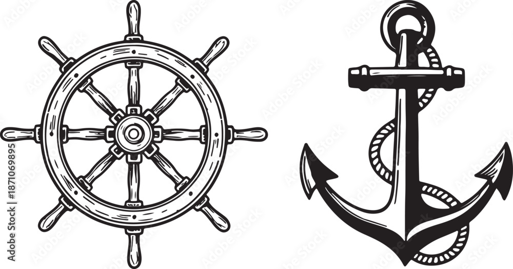 Vintage ship steering wheel and anchor isolated on transparent background #1871069895