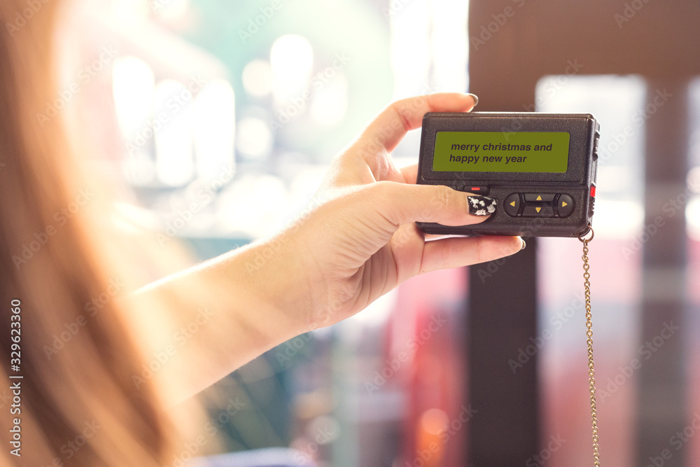 vintage style The message merry christmas and happy new year on the pager screen . , pager in girl Hand . #329623360