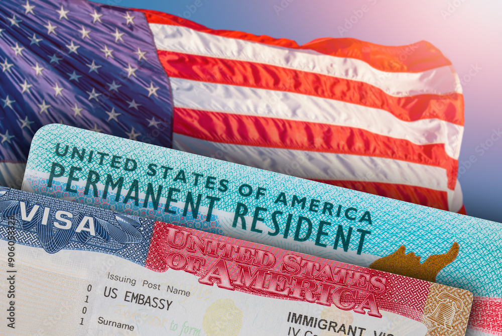 VISA United States of America. Green Card US Permanent resident. Work and Travel ID documents. US Immigrant. Visa for Immigration. Embassy USA. Visa in passport. American flag on background #906053323
