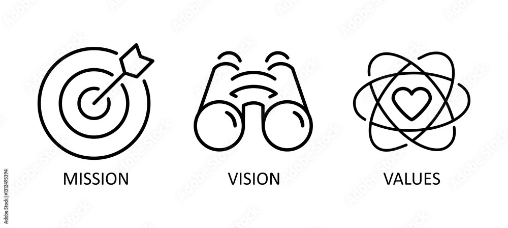 Vision, mission and values editable stroke outline icons set isolated on white background flat vector illustration. Pixel perfect. png #1312495394