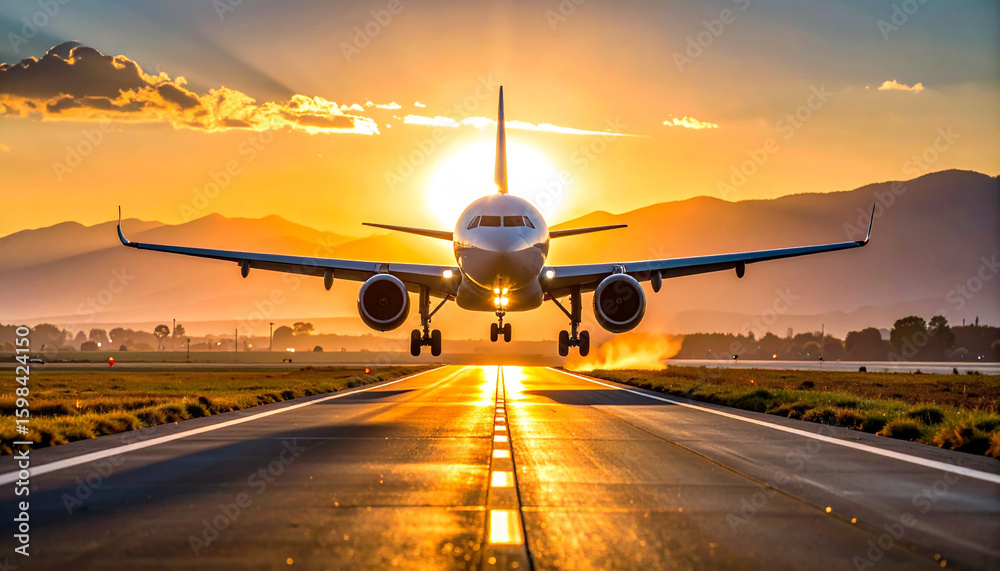 vista de frente de un avion de linea y pasajeros aterrizando o despegando en la pista de aterrizaje de un aeropuerto con luz de atardecer y sol a contraluz #1598424150