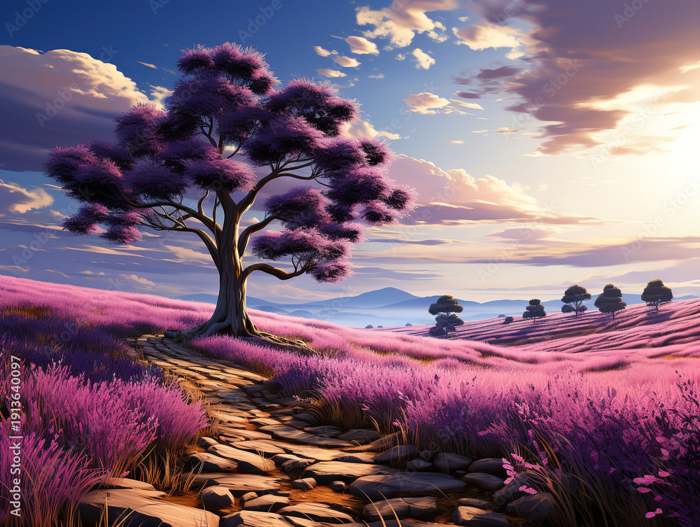 Vivid lavender field in Provence with a single, isolated tree #1913640097