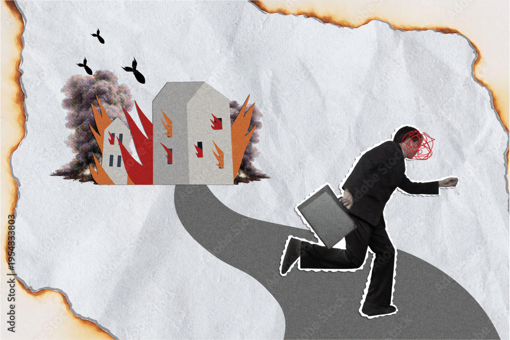 War collage urgency A businessman fleeing from destruction. #1954333803