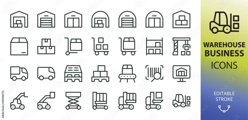 Warehouse line icons set. Set of warehouse building, forklift, stock picker, boom lift, telehandler, pallet, warehouse trolley cart, storage shelves vector icon with editable stroke #1443006772