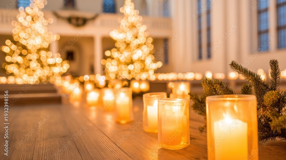 Warm candles light a festive space with Christmas trees in a church #1932398156