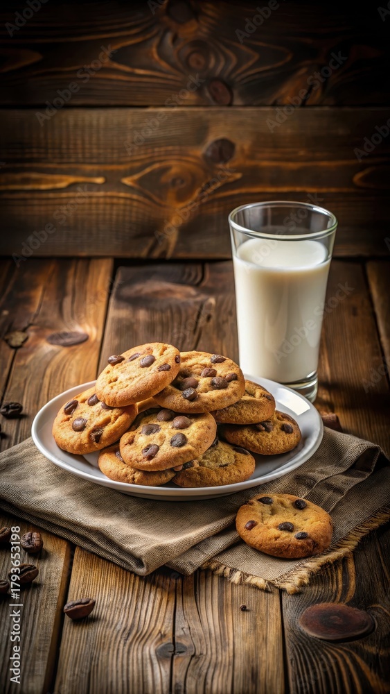 Warm cookie plate with a few chocolate drops and a glass of cold milk on a rustic wooden table #1793653198