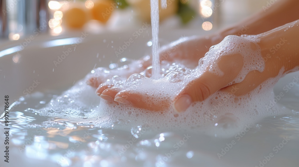Washing hands in soapy foam under running water in the bathroom sink, hygiene and health. #997978648