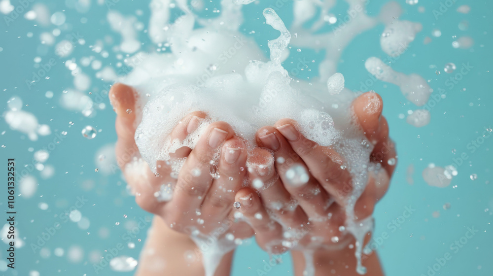 Washing hands with soap bubbles creates refreshing and clean feeling. image captures joy of cleanliness and importance of hygiene in daily life #1061332531