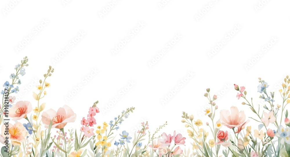 Watercolor floral border with charming summer meadow flowers on white background for card design #1915218157