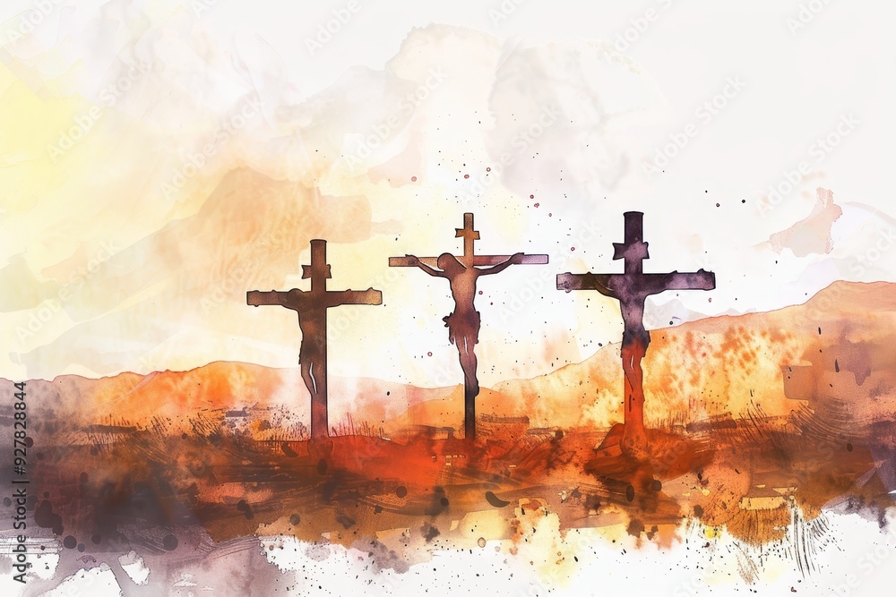 Watercolor Illustration of Jesus on the Cross with Three Crosses Behind. #927828844